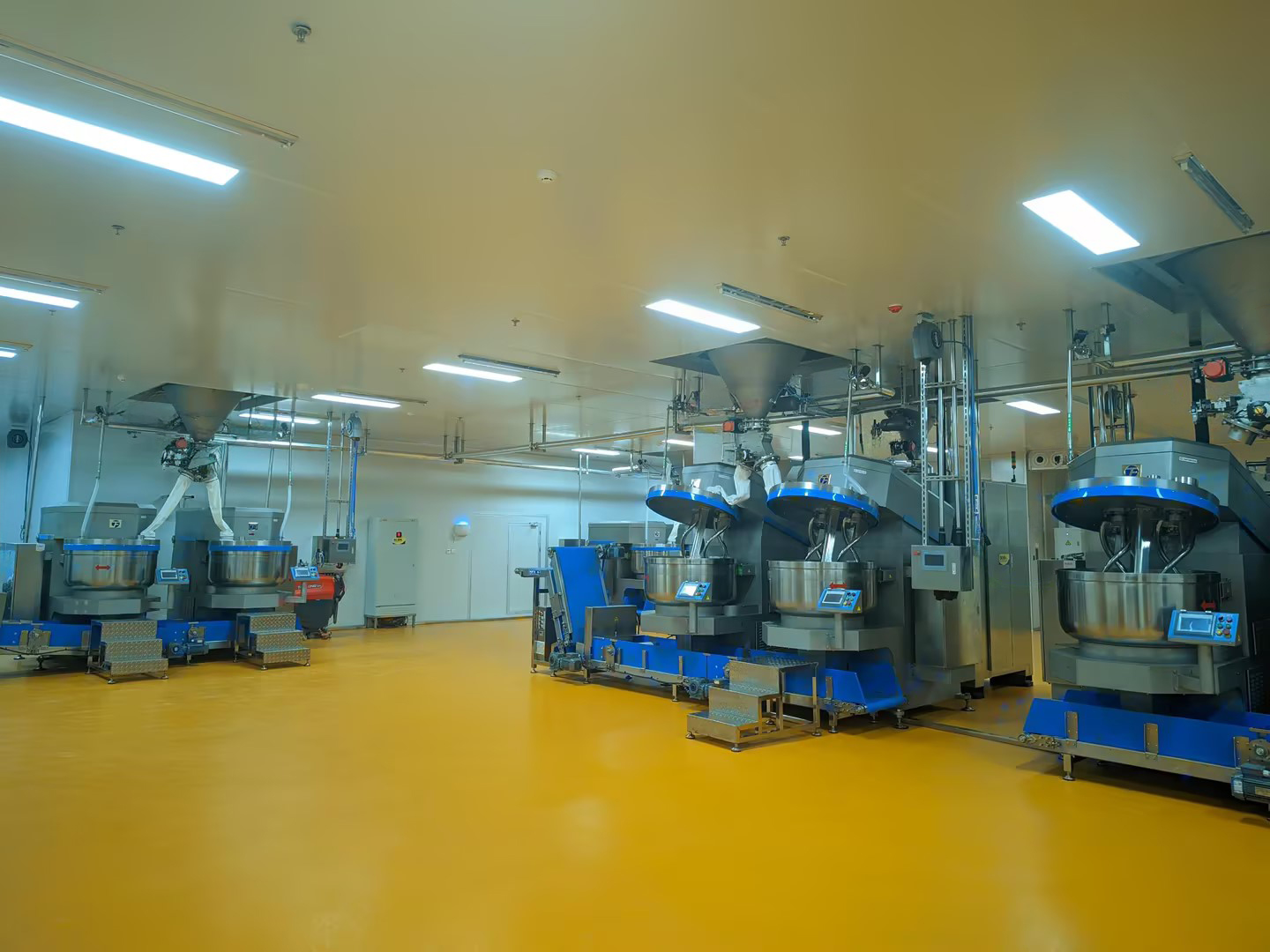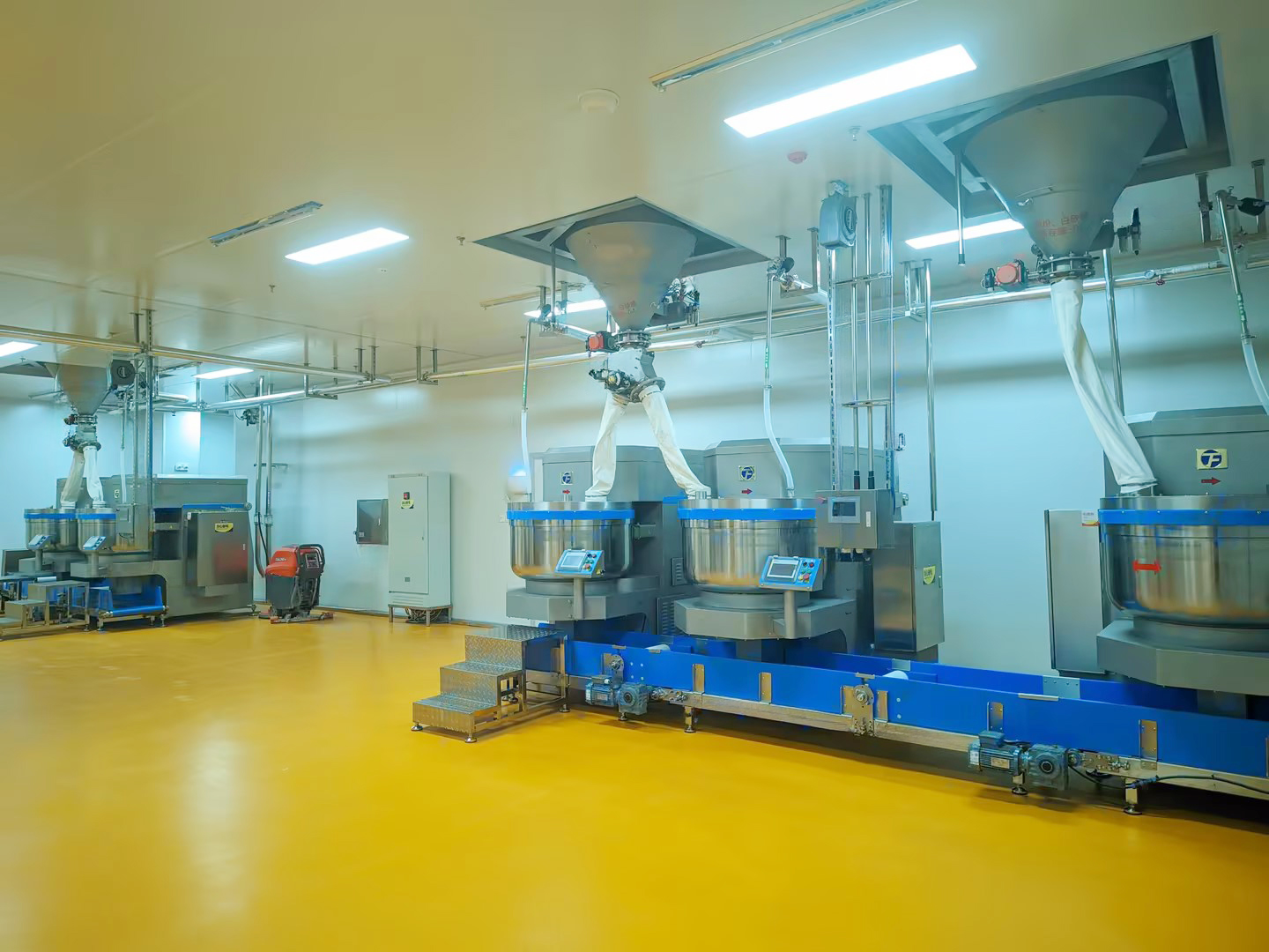称重储存系统:其包含7个称重罐,可根据客户多种配方要求,将面粉、砂糖、工艺水定量输送进行至7个称重罐,再垂直落料至11个搅拌机。配料精度可高达千分之三 ,确保了产品的一致性以及产品质量。